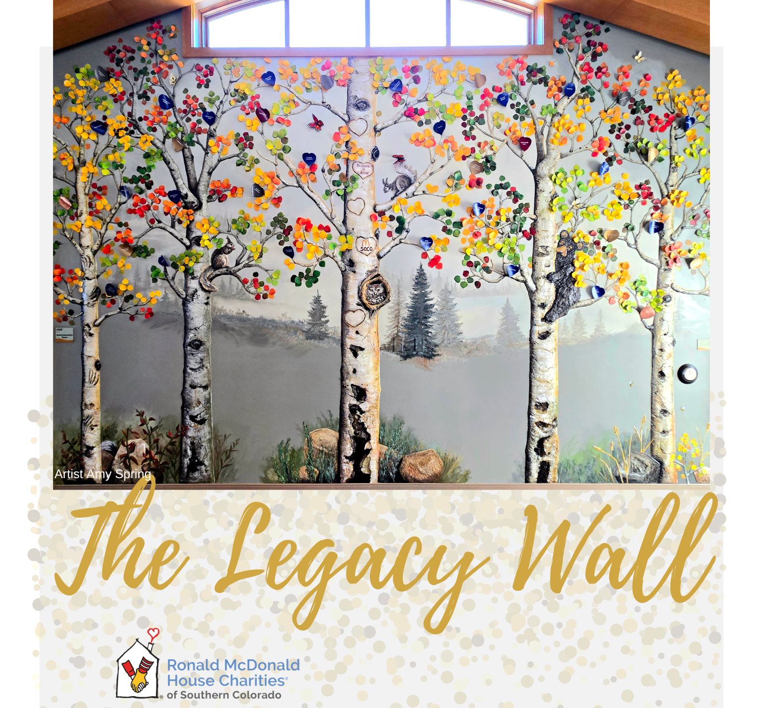 The Legacy Wall is an original and permanent installation, featuring Colorado Aspen trees, showcasing how, “we are all connected, rooted in love.”
